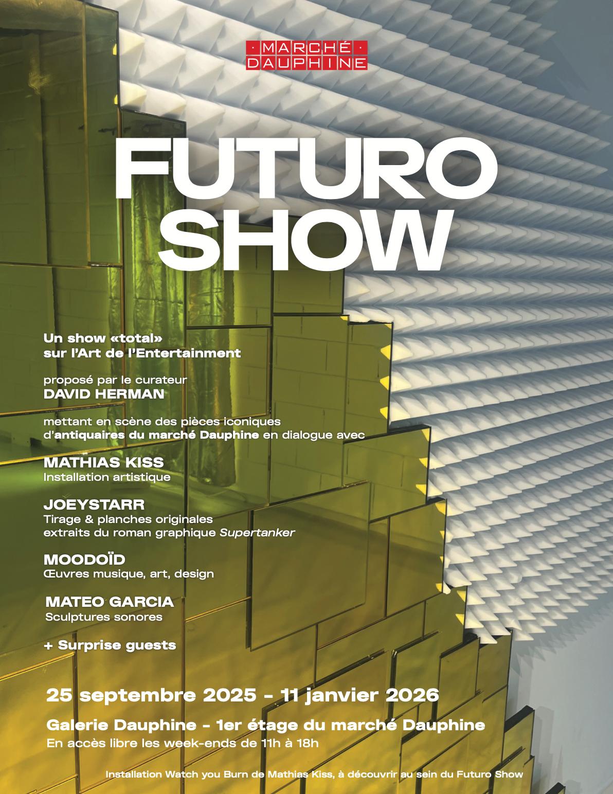 The Futuro Show is conceived as an exhibition-event reflecting the “living” spirit of the Marché Dauphine—particularly its roots in utopian design and 20th-century pop culture, embodied most strikingly in the market’s central square by the Maison Futuro, a Space Age architectural relic created in 1968 by Matti Suuronen.
